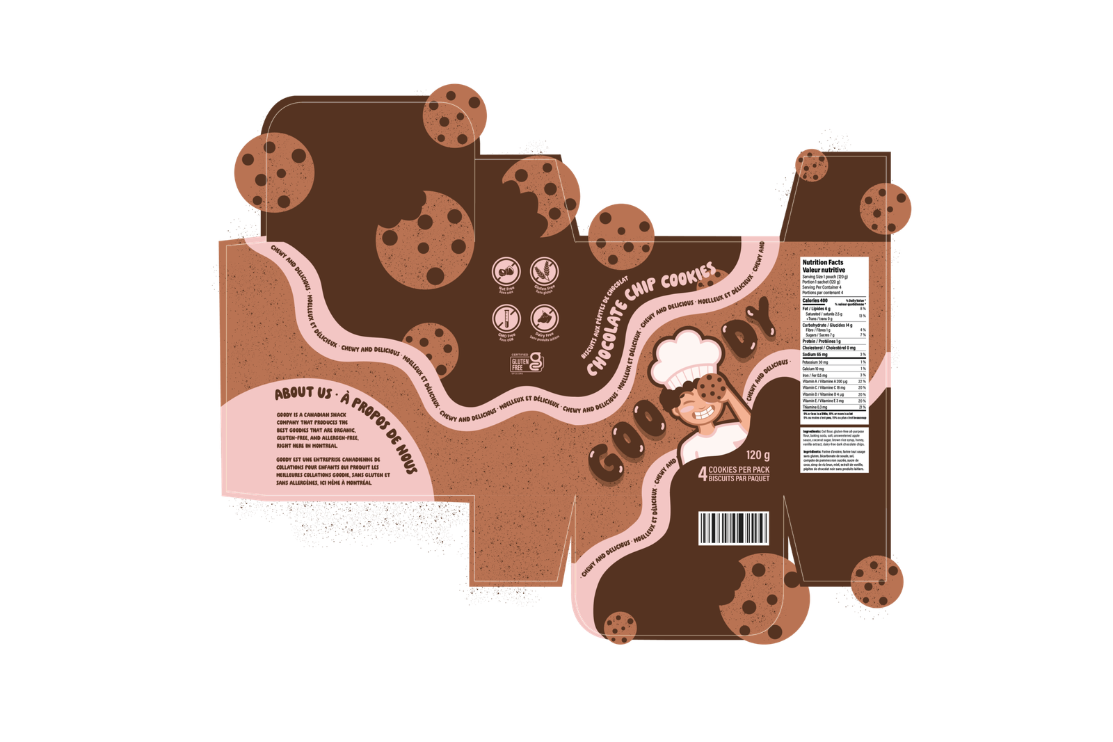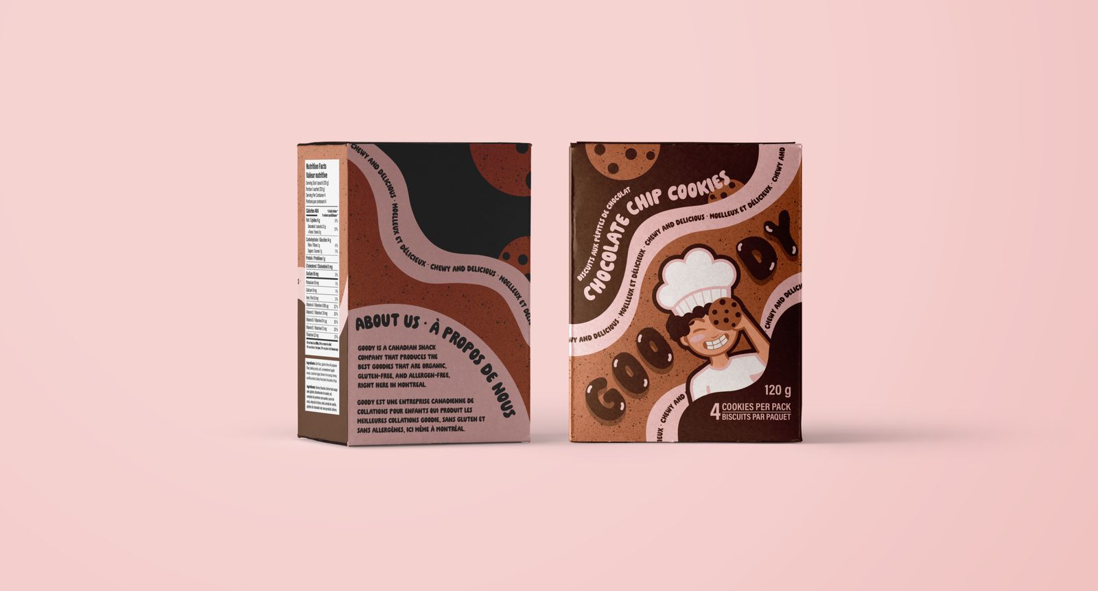 What makes Goody stand out is its healthy take on snacks to satisfy the sweet tooth of kids. To promote this quality, my design consisted of three main aspects: a warm and homey colour palette, organic shapes paired with a fun illustration, and food icons indicating allergen-free information.